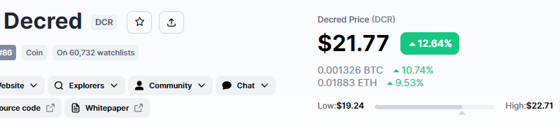 Decred es el gran ganador de la jornada según Coinmarketcap con más del 12% de alza en su precio