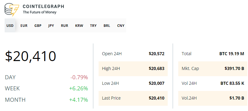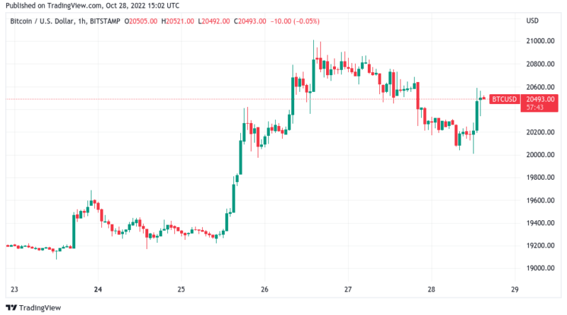 Bitcoin (BTC) volvió a subir hasta los USD 20,500 en la apertura de Wall Street del 28 de octubre, mientras