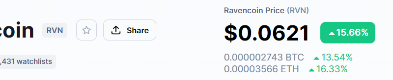 Ravencoin es el token ganador de la jornada según Coinmarketcap con más de 15% de ganancias en su precio