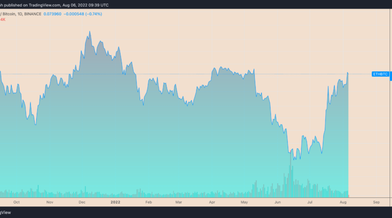 Ether (ETH), la moneda nativa de Ethereum, ha continuado su tendencia alcista frente a Bitcoin (BTC) a medida que crece