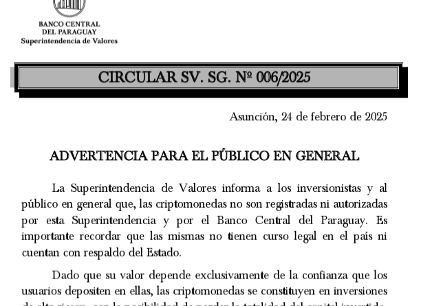 Leer másLa Superintendencia de Valores informó que las criptomonedas no están registradas ni autorizadas por el Banco Central de Paraguay. La