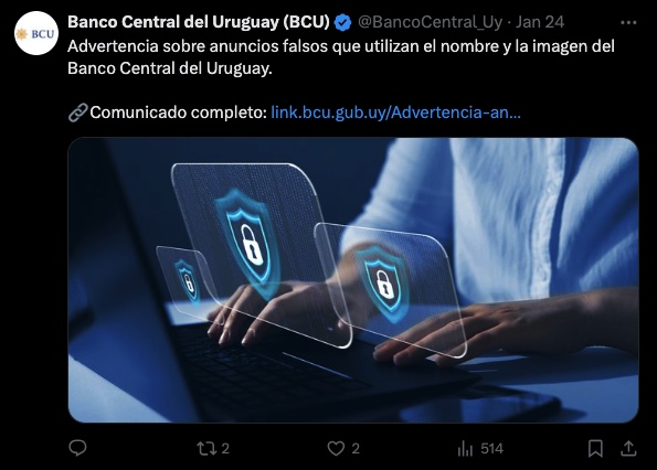 Leer másDesde el Banco Central del Uruguay (BCU) alertaron a la ciudadanía sobre potenciales estafas financieras que utilizan su imagen y