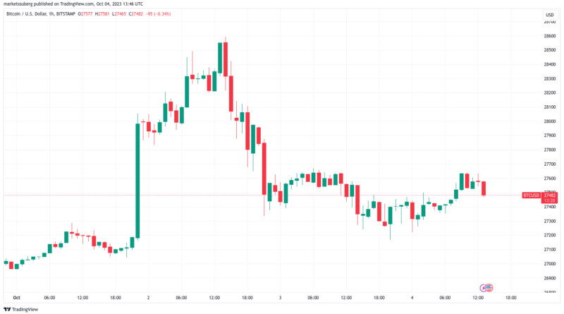 Bitcoin (BTC) se mantuvo pegado a los USD 27,500 en la apertura de Wall Street del 4 de octubre, mientras
