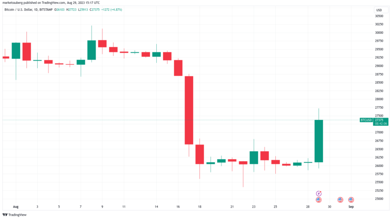 Leer másBitcoin (BTC) se acercó a máximos de dos semanas el 29 de agosto al conocerse la noticia de que la