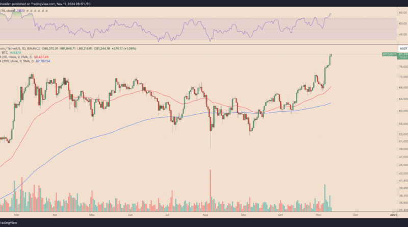 Leer másBitcoin (BTC) ha subido alrededor de un 6.75% para alcanzar un nuevo máximo histórico de aproximadamente 81,845 dólares en las primeras
