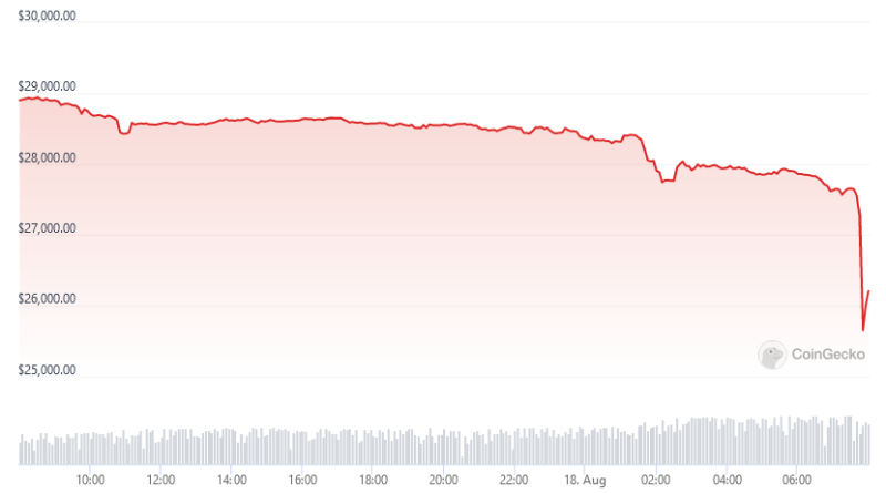 Leer másBitcoin (BTC) ha caído un 8% en menos de 10 minutos, situándose temporalmente por debajo de USD 26,000, tras varios días