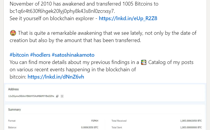 Leer másUna billetera de Bitcoin (BTC) que contenía 1,005 BTC acuñados en 2010 ha vuelto a activarse, con un usuario, de momento