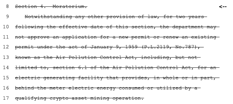 Un representante de la Cámara de Pensilvania ha eliminado una prohibición de minería de criptomonedas de dos años de su