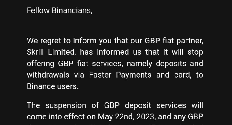 Binance perderá a su proveedor de entrada y salida de libras esterlinas en 9 semanas