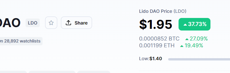 Lido DAO (LDO) es el token ganador según Coinmarketcap con más de 37% de ganancias en su precio