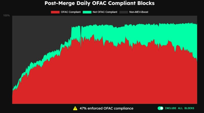 Los bloques que cumplen los requisitos de la OFAC en Ethereum alcanzan su nivel más bajo en tres meses: de un 47%