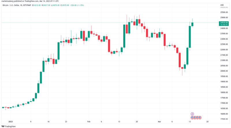 Leer másBitcoin (BTC) repuntó hasta alcanzar los USD 25,000 el 16 de marzo, a la espera de una decisión clave sobre