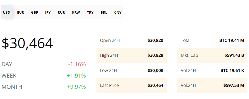 Leer másBitcoin (BTC) rondó los USD 30,500 en la apertura de Wall Street del 26 de junio, mientras los alcistas mantenían